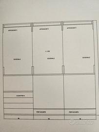 Secondo lato composto da 3 moduli base 90 cm l'uno, di cui 1 modulo attrezzato con 5 scaffali e gli altri due moduli composti da area appendiabiti + cassettiere.