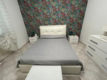 Vendo mobili per camera da letto e soggiorno. Sono presenti: letto matrimoniale contenitore a 2 piazze; armadio a 6 ante; 2 comodini; 1 comó; 1 puff contenitore bianco; 1 mobile porta TV; 2 mensole da soggiorno; 1 tavolo; 4 sedie.