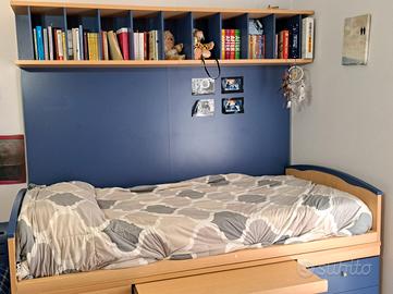 - 2 pensili e paretina azzurra: libreria h = 37cm, lungh. 208 cm profondità 30 cm, contenitore lungh. 135 cm profondità 32, paretina azzurra su mobile letto h=190 cm lunga 208 cm.