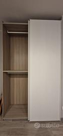 Due porte scorrevoli, colore bianco, quattro ripiani, quattro appendiabiti.
