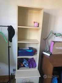 Mobili per cameretta composti da due librerie con cassetti piccole laterali unite con ripiani a quella centrale piu grande. I due letti da una piazza sono smontati e possono essere posizionati sotto le mensole formando una parete. E’ stata usata pochissimo .
