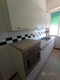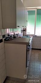 Cucinac omposta da: * una colonna da 60 cm con forno elettrico e un cassettone, *una base di 195 cm, composta da un mobile da 90 cm con due antine, *un mobile da 60 cm con tre cassettoni e quattro fornelli a gas,*un mobile da 45 cm con antina. La parte in alto con tre pensili con antine, da 60 cm, da 90 cm e da 60 cm. Colonna con forno H = 114 cm, il resto della base con piano e fornelli H =90 1° pensile da 60 cm, H = 72 cm 2° pensile da 90, H = 72 cm 3° pensile da 60 (sopra i fornelli) H = 66 cm
