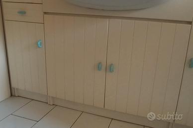 Mobili per bagno composti da specchiera L80xH115 con pensili laterali H115xL30xP22, ripiano in marmo con lavandino L140xP35, base H80xL30xP35 +base due ante H60xL60xP35+base due cassetti H10 e sportello H60xL30xP35. Disponibili su richiesta altre fotografie.