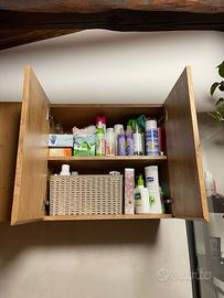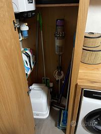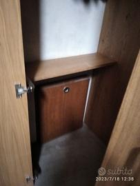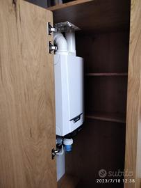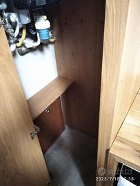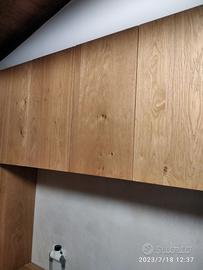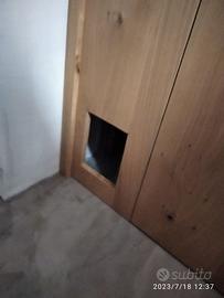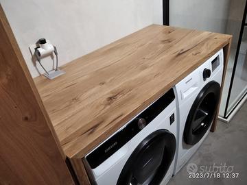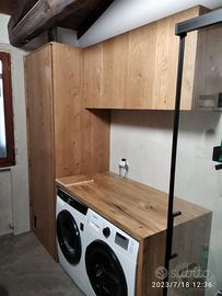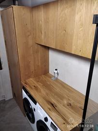 Copricaldaia: costruito in listellare ricoperto di rovere nodato con spessore fianchi da 19 mm che poi verrà spazzolato, misura lunghezza (nella parte della parete) 80 cm h fino sotto piastrelle 225 prof. (verso la finestra) 70 cm in cui in quel lato troveremo una spalletta fissa da 30 cm con traforatura per passaggio gatto sul lato della finestra in cui si aprirà 1 sola porta da circa 48 cm verso il lato della finestra in modo da agevolare entrata non solo per la manutenzione ma anche come ripostiglio, con cerniere da cucina regolabili ammortizzate in chiusura e apertura tramite fresata gola ricavata direttamente sulla spalletta fissa. All’interno troveremo disposto nella parte (sotto alla caldaia) 3 ripiani aggiustabili in altezza per poter riporre detergenti o altro (i sotto caldaia e gli altri 2 sul lato muro pensili). Chiusura superiore con cappello in modo da non far entrare la polvere e in modo che faccia da struttura al tutto, unito con spine e barilotti in ferro. Copriasciugatrice e Coprilavatrice: tutto costruito a 3 strati con cartelle esterne in massello di rovere nodato con spessore del tutto 4 cm in cui troveremo 2 fianchi verticali e il top superiore che terrà tutto unito e tutta la struttura avrà una misura lunghezza totale 133 circa h 90 prof. 70 tutto spazzolato e verrà fissato a muro e relative catene posteriori in modo che non si muova. Pensili: costruiti in listellare ricoperto di rovere nodato ne verranno fatti 2 per arrivare ad una lunghezza totale di 133 prof. 35 h 60 sospesi in cui troveremo 2 blocchi separati con 2 ante a dx e 2 a sx con ripiano interno aggiustabile in altezza, completo di attaccaglie posteriori per fissaggio a muro e con schienale da 8 mm, apertura su cerniere da cucina ammortizzate in chiusura completo di finitura effetto grezzo naturale trasparente su tutto in modo da isolarlo. prezzo compreso finitura e imballo non comprendente di iva. mobile costruito su commissione e venduto. ASTENERSI RIVENDITORI E COMMERCIANTI