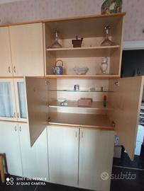 Mobili disponibili: tavolo rotondo diametro 115 (estendibile a 150) H78/buffet top L270xP45xH2 con 2 basi (due sportelli daL90xH100xP45 e 1 cassettiera 6 cassetti H15xL90xP45)/credenza con vetrina e ripiani 2 colonne L90xH230xP44/6 sedie. Disponibili altre foto su richiesta.