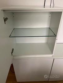 Mobili per salotto/soggiorno Dall’Agnese legno bianco laccato con piani in vetro. Due moduli 640x390h670mm + un modulo a tre ante 1924x390h670mm.