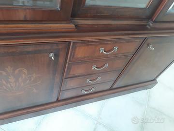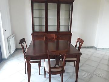 Vendesi stanza da pranzo in legno noce composta da vetrina lunga 180 cm--larga 50 cm --altezza 230 cm,---tavolo 120 x 120 cm estensibile di altri 50 cm,--quattro sedie con seduta in stoffa. Usata poche volte. Come nuova.No perditempo