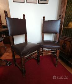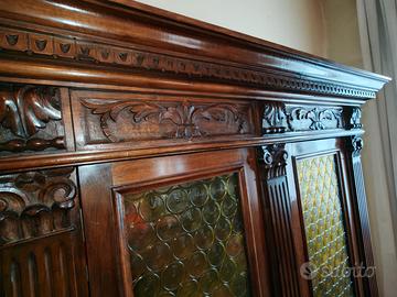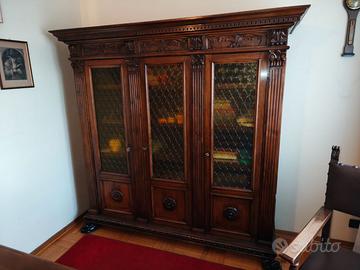 Studio composto da una vetrinetta/libreria, una scrivania con cassetti, una poltroncina con braccioli e 2 sedie - inizio 900, legno massiccio finemente intarsiato. Elegante composizione per uno studio professionale