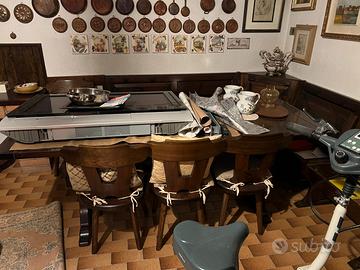 Si vendono i seguenti arredi : tavolo lungo 2100 mm. Con cassapanca e sedie + mobile bar con mensole e pouf a seduta + credenza con mensola superiore il tutto per soli 1500 euro . Non è compreso lo smontaggio e il trasporto a carico di chi è interessato .