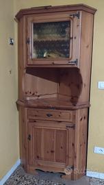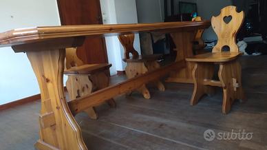 Mobili usati stile tirolese: credenza, tavolo, mobile angolare e 5 sedie. Segni di usura. Vendibili separati. Spedizione e trasporto a carico acquirente.