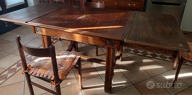 • Tavolo allungabile in noce dei primi del '900 con rilievi. 82 cm × 90 cm × 110 cm. Si vendono insieme due plance da 52 cm di lunghezza ciascuna per allungare il tavolo. Lunghezza totale con plance 210 cm. Si regalano nel blocco sei sedie in legno del medesimo tipo.