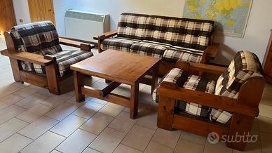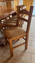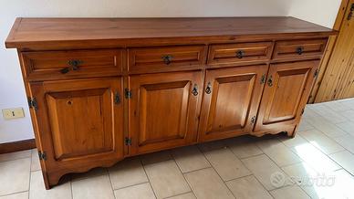 Lotto mobili rustici composto da: Tavolo in legno con 12 sedie impagliate, misure: 299,5 cm lunghezza; 88 cm larghezza; 75 cm altezza, spessore tavola 6 cm. Due credenze identiche in legno con cassetti e 4 ante, misure: 195,5 cm lunghezza; 46 cm larghezza, 90 cm altezza. Divano letto con 2 poltrone e tavolino (78x78 cm), una delle due poltrone presenta il rivestimento del cuscino della seduta danneggiato. Mobiletto da angolo (lunghezza/larghezza 59-60, altezza 75,5 cm) I mobili si trovano in mansarda, smontaggio e trasporto sono interamente a carico dell'acquirente. Per il trasporto al piano inferiore sarà necessario rimuovere temporaneamente una parte del corrimano e uno scalino della scala a chiocciola in legno, operazione non complessa ma che richiede un minimo di manualità. Per chi è disposto a organizzarsi per il ritiro, il prezzo è trattabile.