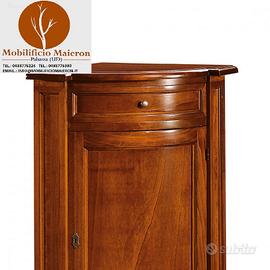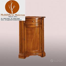 Angolo con un'anta con ripiano interno e un cassetto. Forma arrotondata sul fronte. Anta, spalle e cassetto riquadrati, gambe a mensola che alleggeriscono l'impatto visivo del mobile. Questo mobile da complemento può essere utilizzato in tante zone della casa. Si tratta di un mobile che permette di risolvere con eleganza molte differenti esigenze d'arredamento.