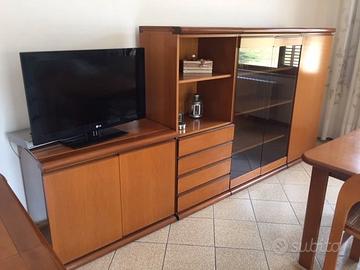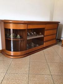 Mobile per sala, con tavolo allungabile e sedie, con vetrinette e cassettiere; profili e struttura portante in massello; moduli da 30 – 60 – 90 cm intercambiabili.