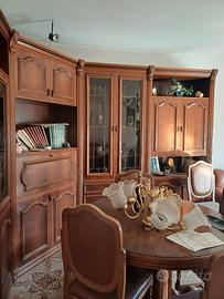 mobile in legno a 4 colonne con vetrine , tavolo rotondo con 4 sedie imbottite