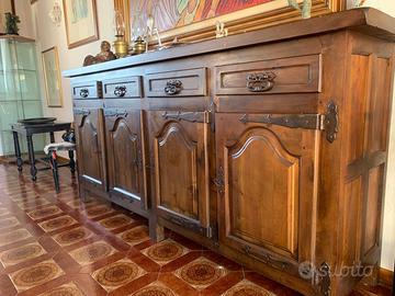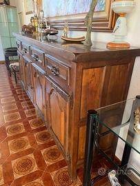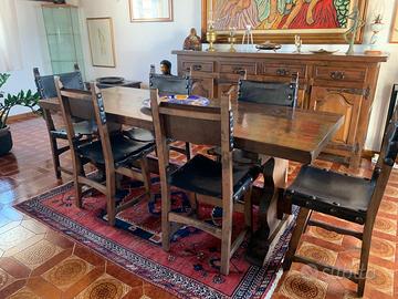 Tavolo Fratino in Legno Massello + 6 Sedie in Cuoio. Vendesi set da sala da pranzo composto da un grande tavolo modello "Fratino" e 6 sedie coordinate. Un arredo di alta qualità, solido e senza tempo, ideale per chi ama lo stile rustico, medievale o neo-rinascimentale. Caratteristiche del set: - Il Tavolo: Realizzato in legno massello con piano di grande spessore e robuste gambe lavorate unite da una traversa centrale. Il piano mostra le bellissime venature naturali del legno. - Le 6 Sedie: Modello con struttura in legno e seduta/schienale in vero cuoio nero, fissato con borchie metalliche a vista che conferiscono un look austero ed elegante. - Stato: Da prevedere trattamento antitarlo (facile da fare). Un set perfetto per arredare taverne, case di campagna, baite o saloni di rappresentanza. DIMENSIONE TAVOLO CIRCA: P 78 cm X L 198 cm X H 103 cm Grande credenza in legno massello stile rusticoantico. Grande credenza in legno massello, stile rustico/antico, ideale per arredare una sala da pranzo o un soggiorno. Mobile di grande presenza, con finiture curate e ferramenta in ferro battuto originale che ne esalta il carattere autentico. Dotato di più cassetti superiori e ampie ante con molto spazio interno. Perfetto come: - credenza per sala - mobile porta stoviglie - elemento d’arredo di carattere Struttura estremamente solida e robusta. Condizioni: buone, normali segni del tempo che ne aumentano il fascino. Da prevedere trattamento antitarlo (facile da fare). DIMENSIONI CIRCA: P 48 cm X L 215 cm X H 103 cm Solo ritiro a mano, no spedizione.