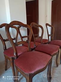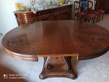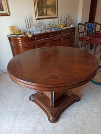 Vendo sala da pranzo in stile classico costituita da vetrina cristalliera 3 ante, bancone 5 ante, tavolo tondo allungabile e 6 poltroncine tappezzato in velluto bordeaux. Il tutto è in ottimo stato di conservazione e di eccellente fattura.