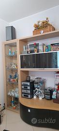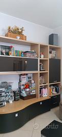 Mobili come nuovi. Vetrinetta alta verticale collegata ad un vasto tavolo e cubotti con varie mensole, ante(una in vetro) e vari cassetti e cassettoni. Allegato, al mobile unico, un'altra vetrinetta da muro e tavolino reggi-televisore con annesso cassetto e mensola.