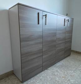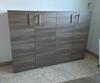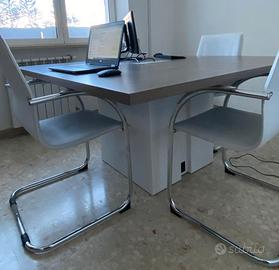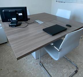 Vendesi: - tavolo 150x150 con predisposizione per elettrificazione con piano in nobilitato melaminico di color tortora e gambe in acciaio bianco - armadio media altezza 180x35x120 ante in nobilitato melaminico di color tortora e struttura color grigio dorian, due ripiani interni modulabili e chiavi di chiusura. Il tavolo si presta ad essere usato come doppia postazione di lavoro o come tavolo riunione. Il tutto è in ottimo stato di conservazione. Gli arredi sono acquistabili insieme al prezzo di € 600,00 Singolarmente € 400,00 il tavolo ed € 300,00 l'armadio