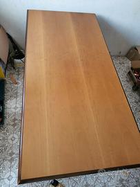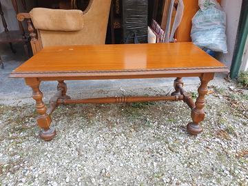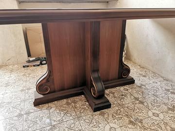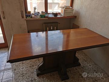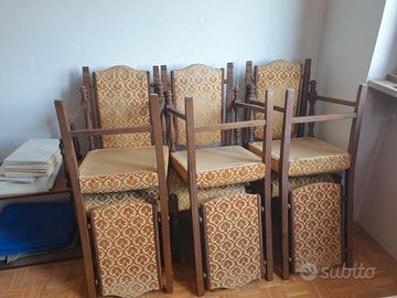Mobile sala con vetrina, tavolo 6 posti con finitura noce e base lavorata, tavolino basso, 6 sedie abbinate da rifare tappezzeria. disponibile subito