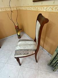 4 ante (parte superiore in vetro, con mensole in vetro e faretti all’interno) mis: H 2,25; L 2,06;P 40cm. Sparecchia tavola 4 sportelli, 1 cassettone centrale e 2 ai lati mis: L2,45; P 62cm; H 110. Tavolo rettangolare con piede centrale mis: 200x100x78; N* 6 sedie in legno rivestite in stoffa.