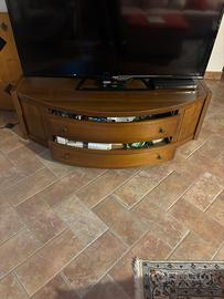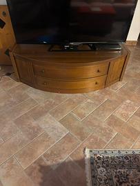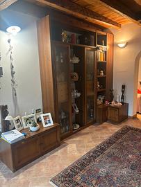 Mobile per salotto impiallacciato composto da: - vetrina con porte in vetro scorrevoli misura cm 230x 237H con angolo incluso - mobile basso con 2 antine misura cm L94xH44xP55 con possibilità di attaccarlo all’angolo della vetrina - mobile TV con 2 cassetti misura cm L146xH44xP63