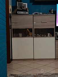 Mensola, mobile sotto televisore con cassettone e 2 sportelli, vetrinetta verticale più altre 2 vetrinette separate e indipendenti dal resto