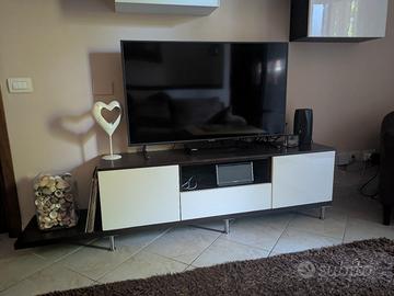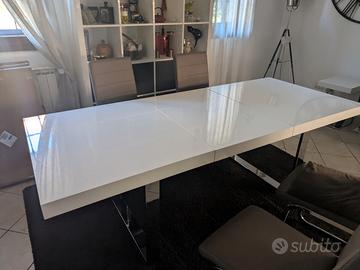 tavolo laccato bianco lucido con meccanismo per allungare molto pratico con zampe in acciaio lucido. Chiuso 90X60 aperto 90x221. Sedie colore tortora nuove 4 con zampe acciaio lucido. Mobile TV marrone con fronte bianco lucido lungo 195 alto 40 senza piedini profondo 37. Moduli Ikea due con anta in vetro e due con anta bianca larghi 59 alti 63 profondi 22