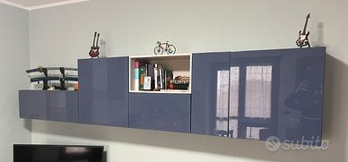 Mobiletti pensili soggiorno in stile moderno (8 elementi) Sono componibili quindi ogni pensile ha le sue misure e può essere montato a piacere… quelli quadrati un po’ più grandi sono L60xH65 mentre quelli rettangolari piccoli 30x65 e di profondità sono tutti 32cm Sotto invece 3 elementi a cassetto color beige (2 uguali lunghi 90 cm ciascuno e 1 piu basso lungo 120 cm) Si trovano già smontati in un magazzino altezza strada.
