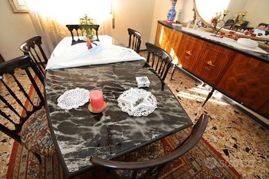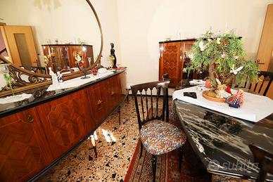 Tinello Soggiorno completo con antine finemente intarsiate e 3 piani (tavolo - credenza - vetrina) in simil-marmo decorato a mano + vetro. Tavolo: Tavolo ovalizzato 1880 x 640 - 920 h 770. Credenza a frontale convesso: 2830 x 350 - 550 h 950 6 ante. Vetrina a frontale convesso poligonale: 1830 x 310 - 450 h 1470 4 ante (2 a giorno). Specchiera ovale: 1808 x 1300. Sedie n°6 h 500 - 930. Pezzi totali 10, ottimamente conservati. Imballaggio e trasporto a cura del compratore