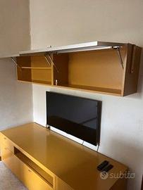 Vendo composizione di mobile per soggiorno composti da base con 5 cassetti/cassettone + porta radio dimensioni: largh. cm.180 - h. cm.50 - prof. cm.60 e pensile/vetrina con due antine in vetro acidato e pistoncini di sostegno dimensioni: largh. cm.180 - h. cm.40 - prof. cm. 32 Colore giallo ocra ed antine in alluminio il tutto praticamente nuovo. Info 347.6640440