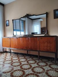 vendo salotto in legno con rivestimento laccato lucido anni 60 composto da mobile con vetrinette , tavolo in pianta ovale in marmo e legno con 6 sedie e mobile con specchiera , il tavolo e la specchiera riportano dei piccoli danneggiamenti lungo i bordi (vedi foto 3 - 5) .