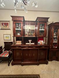 Vendo soggiorno in ottimo stato, composto da due mobili con vetrine realizzate con legno e vero cristallo, oltre tavolo da pranzo e 4 sedie. Per terminare due poltrone in legno.