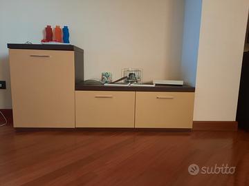 Mobile basso con vani contenitori e superficie d’appoggio.