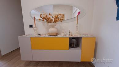 Composizione soggiorno Living 230 x 115 cm con base 246 x 39 cm. Madia ingresso sospesa 184 x 39 cm Colori grigio chiaro e senape.