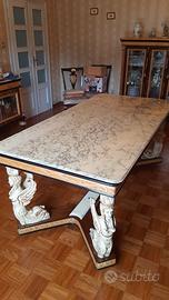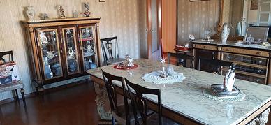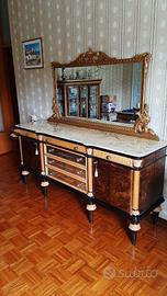 Mobili soggiorno-sala da pranzo in stile impero vintage anni '70 con ripiani in marmo composto da: grande tavolo (cm. 200 x 99 altezza cm. 82), 6 sedie, n.1 vetrinetta 3 ante (cm. 142 x 44 altezza cm. 149), n. 1 credenza grande con specchiera ( cm. 265 x 54 altezza 94, specchio altezza max. 118), n.1 credenza piccola con specchiera (cm.204 x 54, specchio altezza max. 94). Sportelli in radica di noce e cassetti specchiati. Intarsi in acero. Condizioni come nuova. Ritiro mobili presso abitazione.