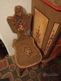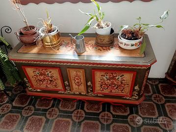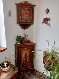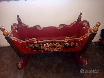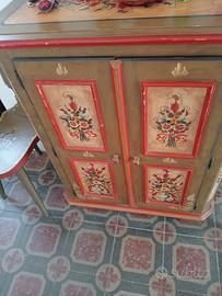 Vendo benissimo mobili in STILE TIROLESE composto da cassettiera , cassapanca , comodino angolare più due mensole ad angolo , 2 sedie e una culla . OTTIMO AFFARE