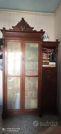 Gruppo di mobili composto da una scrivania di mt 1xmt 2 in noce scuro con decori laterali a triglifi e tondo con motivo floreale e con decoro a unghia sul piano, oltre che rivestimento del piano in pelle di colore vinaccia. Con tre cassetti, di cui quello centrale più ampio. Il motivo decorativo si ripete sulla pedana poggiapiedi e sul frontone della libreria. Questi mobili sono ideali per uno studio notarile o legale. Sono mobili artigianali siciliani di fine ottocento. Si vendono in blocco oppure si può concordare il prezzo sei singoli elementi. Come da foto. Condizioni buone, ma richiede piccoli ritocchi.