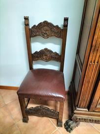Vendo mobili d'arredo per studio legale/notarile artigianali in stile rinascimentale, a zampe di leone, ricchi di fregi e scanalature. Composizione: antica libreria composta da quattro ante; scrivania in legno con cristallo a protezione del piano, tre sedie foderate in pelle con rilievi, di cui una con braccioli. Piccolo mobiletto libreria a due ante. Prima metà del Novecento. Tutto in noce massello. Mobilia usata ma in ottime condizioni. Trasporto a carico dell'acquirente.