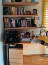 Mobili studio Ikea serie Billy in betulla composti da: 1 grande scrivania ad angolo; 1 cassettiera/schedario su rotelle; 3 mensole; 3 piccole librerie con ante sia in legno che a vetro; 2 grandi librerie con ante a vetro.