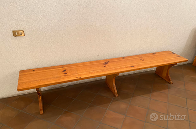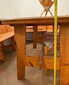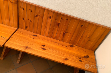 mobili taverna composizione angolo tavolo in pino + panca angolare + panca lineare + 3 sedie. Vendo assieme oppure pezzi separati. Dimensioni: Tavolo: 130x80cm Panca angolare 150x120cm Panca lineare dimensioni 250x40(seduta)x43(altezza)cm.