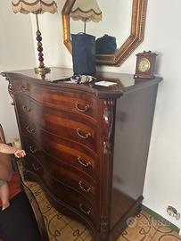 tris di mobili composto da 2 comodini e una cassettiera con secondo cassetto a ribaltina, con all'interno dei cassettini e altri spazi, e con cassetto segreto ai piedi del mobile. I cassetti sono molto capienti e il legno è antico e molto resistente. Può presentarsi come da foto oppure il secondo cassetto può rimanere aperto, tipo bureau, e contenere sopramobili, centrini, lampade e accessori ornamentali. Ritiro a carico del destinatario.