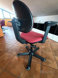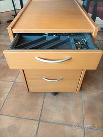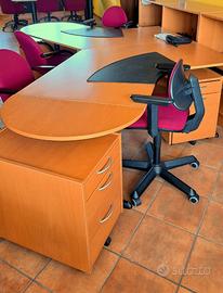 2 scrivanie uguali oblique, corredate da 2 cassettiere con rotelle e divisori, 2 sedie ergonomiche regolabili, 2 sedie, passacavi, 2 sottoblocchi in simil pelle nera. Vera Occasione! Mobili da ritirarsi in loco (Magenta, Milano).