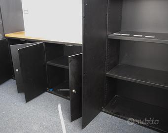 -sette mobiletti/armadio ufficio metallo nero con piano superiore in legno abbinati alle scrivanie , alcuni con scaffalature, uno con portadocumenti scorrevole