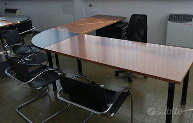 - due grandi scrivanie in legno, una ovale con passaggio cavi centrale per pc( dimensioni 260cm x 130 cm) l'altra ad angolo ( cm 260 x 240 profondità 80 cm)