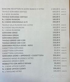 vendo per inutilizzo e cessazione attività mobili vari ufficio, usati pochissimo e in ottimo stato, come da elenco da foto, mobili di qualità e professionali, molto robusti, anche singolarmente, ritiro a cura dell'acquirente, visibili a Verona, zona Quadrante Europa,