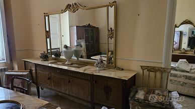 Vendo cristalliera, armadio camera da letto a 6 ante con cassettiera interna, mobile camera da letto con piano in marmo e specchio, letto matrimoniale e due comodini con piano in marmo, mobile sala da pranzo in marmo con venature rosa e specchiera, tavolo sala da pranzo con piano in marmo con venature rosa.