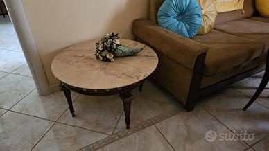 Vendo libreria porta TV con due letti girevoli, divano con letto singolo interno, tavolo da salotto con piano in marmo e venature rosa, tavolino basso in legno intarsiato, carrello, colonnina in marmo.