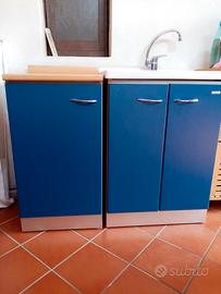 3 Mobili bagno blu: armadietto basso 60x85x50, armadietto alto 60x140x60, armadietto con lavello 64x85x50,scrivania con comodino.