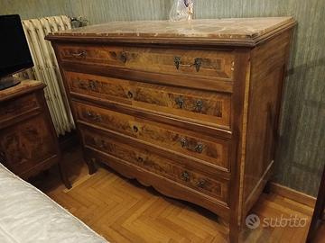 Cassettiera/comò in stile Luigi Filippo (epoca di riferimento: metà ottocento) composto da quattro cassettoni finemente intarsiati in noce e radica di noce; il tutto completato da un piano in marmo rosato dalle venature chiare.